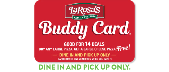 Get the LaRosa’s App! Score app-only deals, get order updates, save your Buddy Card, and reorder favorites in a tap! DOWNLOAD APP